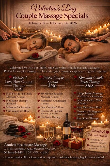 Annie’s Healthcare Massage is a professional massage studio welcoming both men and women, conveniently located at 7515 Presidential LN #22G, Manassas, VA 20109. We are open Mon–Sun 9:00am–9:00pm to fit your schedule.